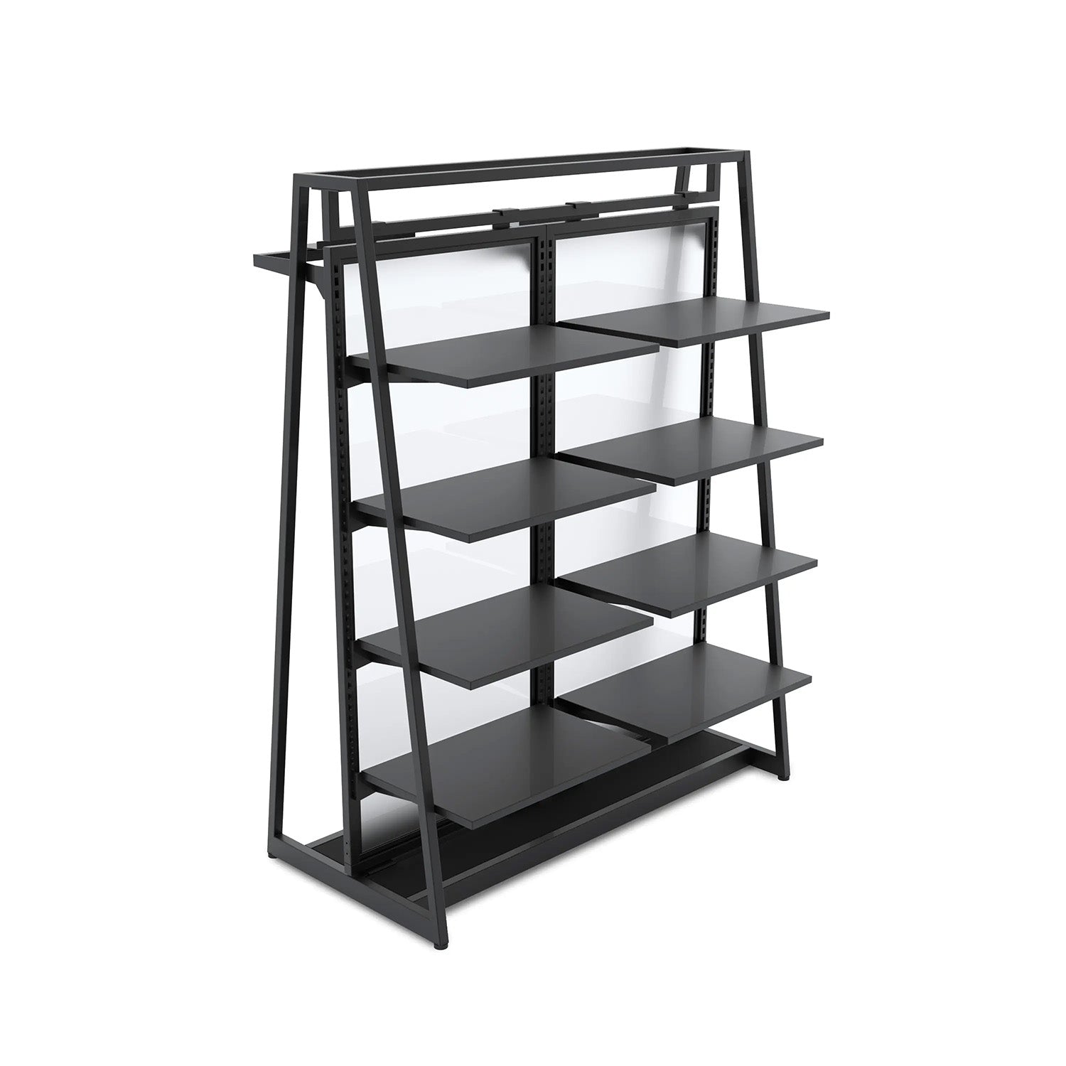 This kit includes the 48" floor merchandiser, two frosted center panels, two hang rails and eight metal shelves. The shelves have welded brackets and measure 21¾" wide x 14" deep x ¾" thick. The overall dimensions of the floor merchandiser are 48 in. W x 24 in. L x 62 in. H. Includes levelers.