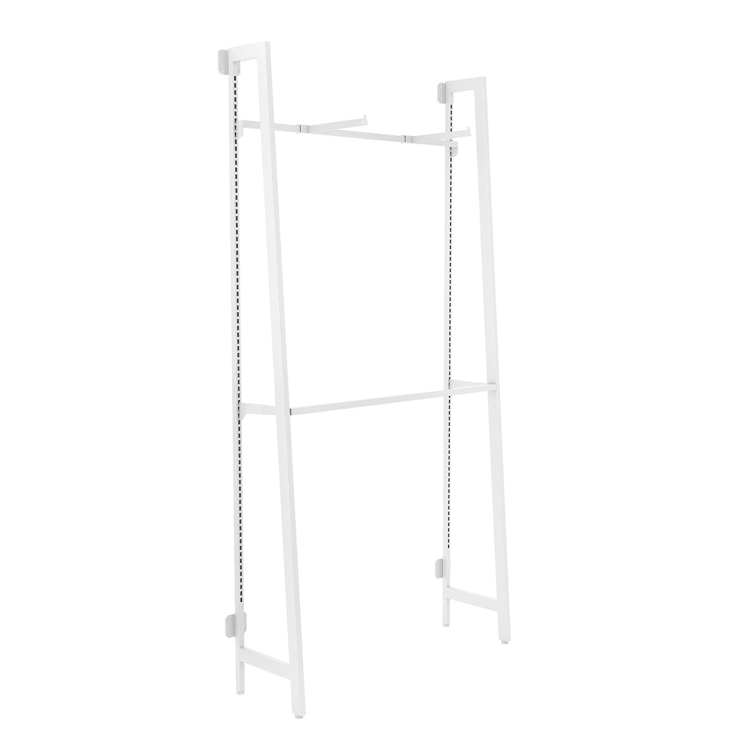 The outriggers have slotting up the entire rear vertical uprights, giving you the ultimate in height adjustability for your optional display accessories. This display kit includes one 48”x11” and two 12” long saddle mount faceouts and mounting bar. This setup is ideal for displaying hanging apparel.