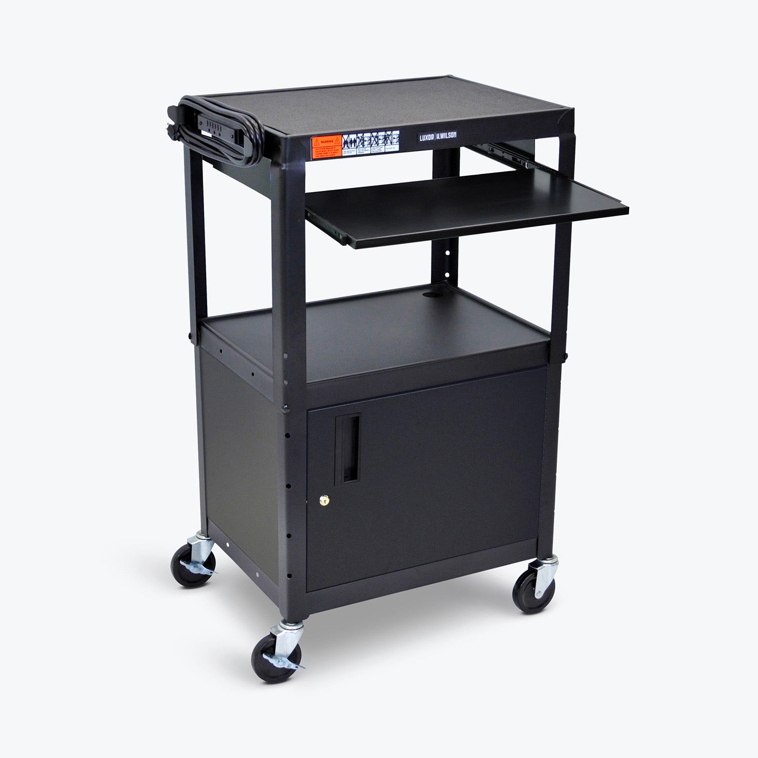 Storage, strength and a smart design come together in this utility cart to accommodate a variety of AV needs and users. Features include a retractable keyboard/tablet tray, middle storage shelf and a locking storage cabinet to store equipment. And since the top shelf can be adjusted to heights between 24" and 42" in 2" increments, this cart comfortably suits presenters of varying heights. Full-swivel 4" casters allow for easy movement and two locking brakes provide stability when you need it. Steel construction ensures the cart is built to last.
