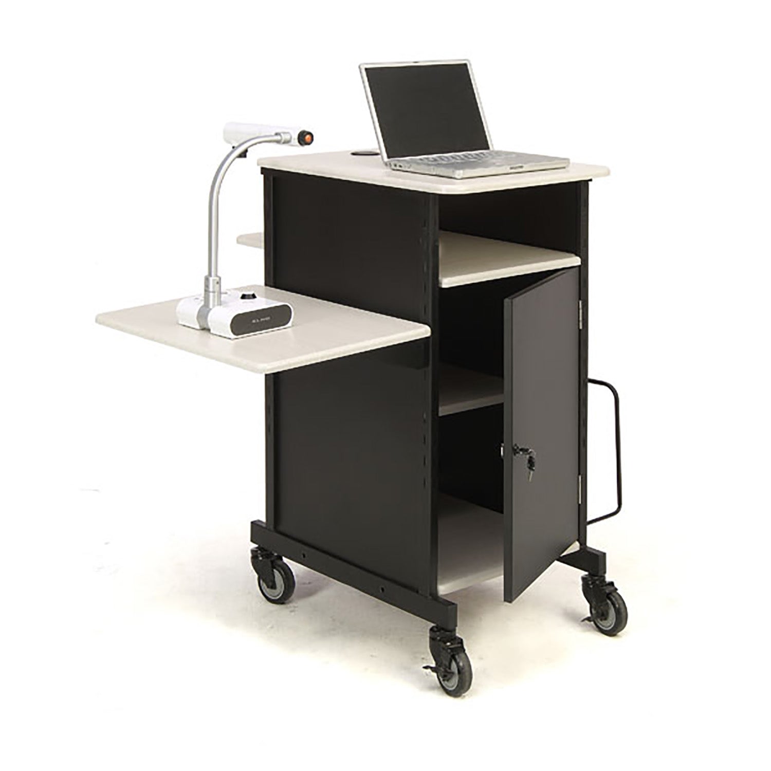 Jumbo Plus Presentation Cart. The Jumbo Plus A/V Presentation Cart offers a multifunctional, wide presentation cart with ample storage and display space for audio-visual equipment like laptops, projectors and document cameras. The extra-large work surface and optional broad, adjustable side shelf make for easy set up for all presentations with easy access to your equipment. Safely protect all of your capable A/V devices in the spacious locking storage cabinet with an adjustable (or removable) middle shelf. Constructed of an 18 gauge black steel frame with an attractive Ivory wood grain finish. Enjoy smooth mobility on 4-inch heavy-duty casters (two locking). Wire management and grommets included to help simplify your presentations.