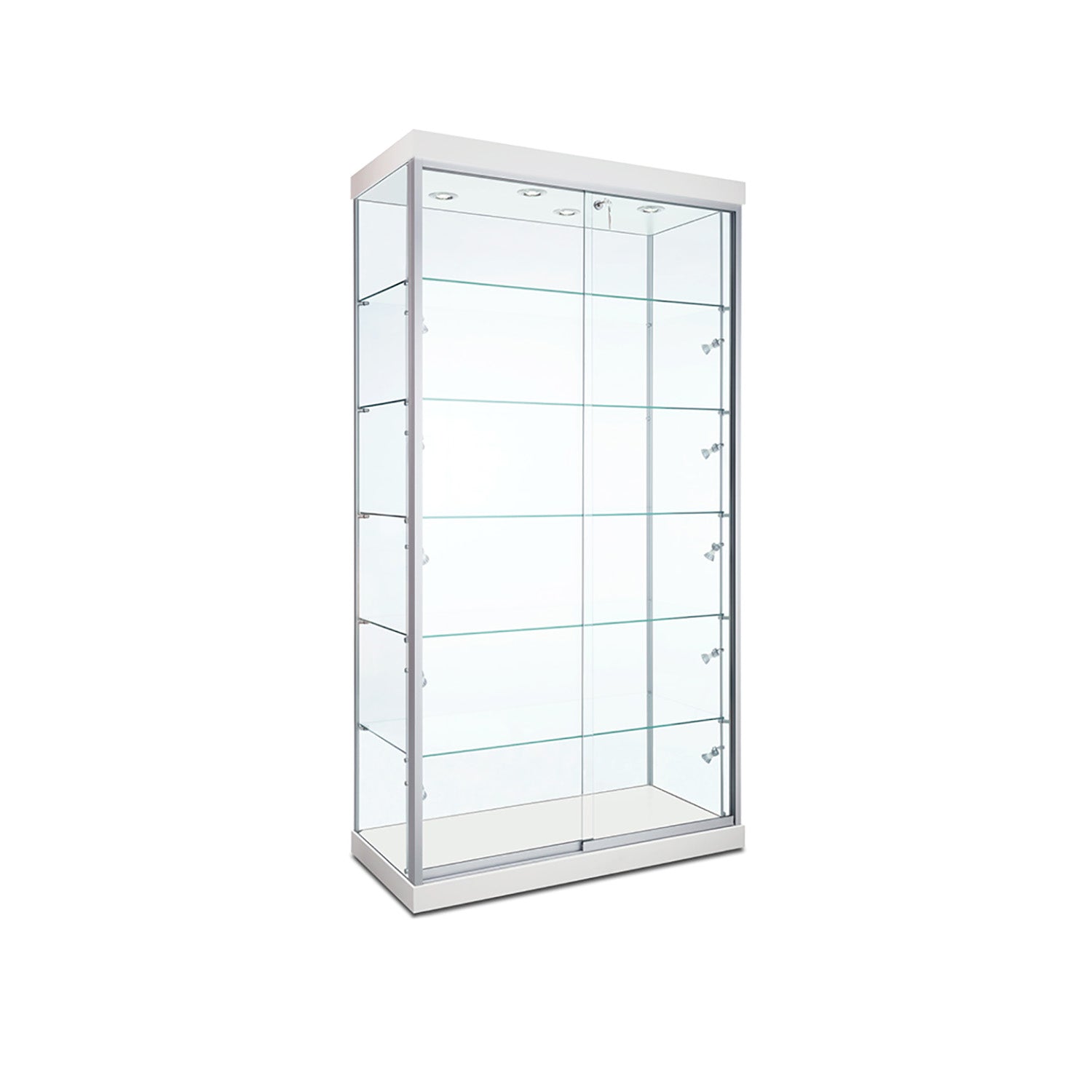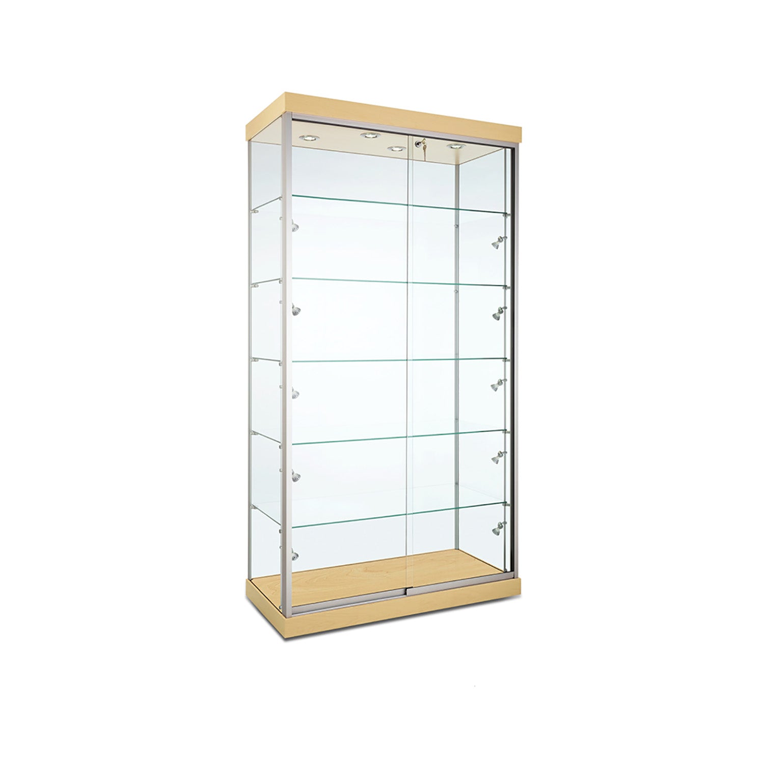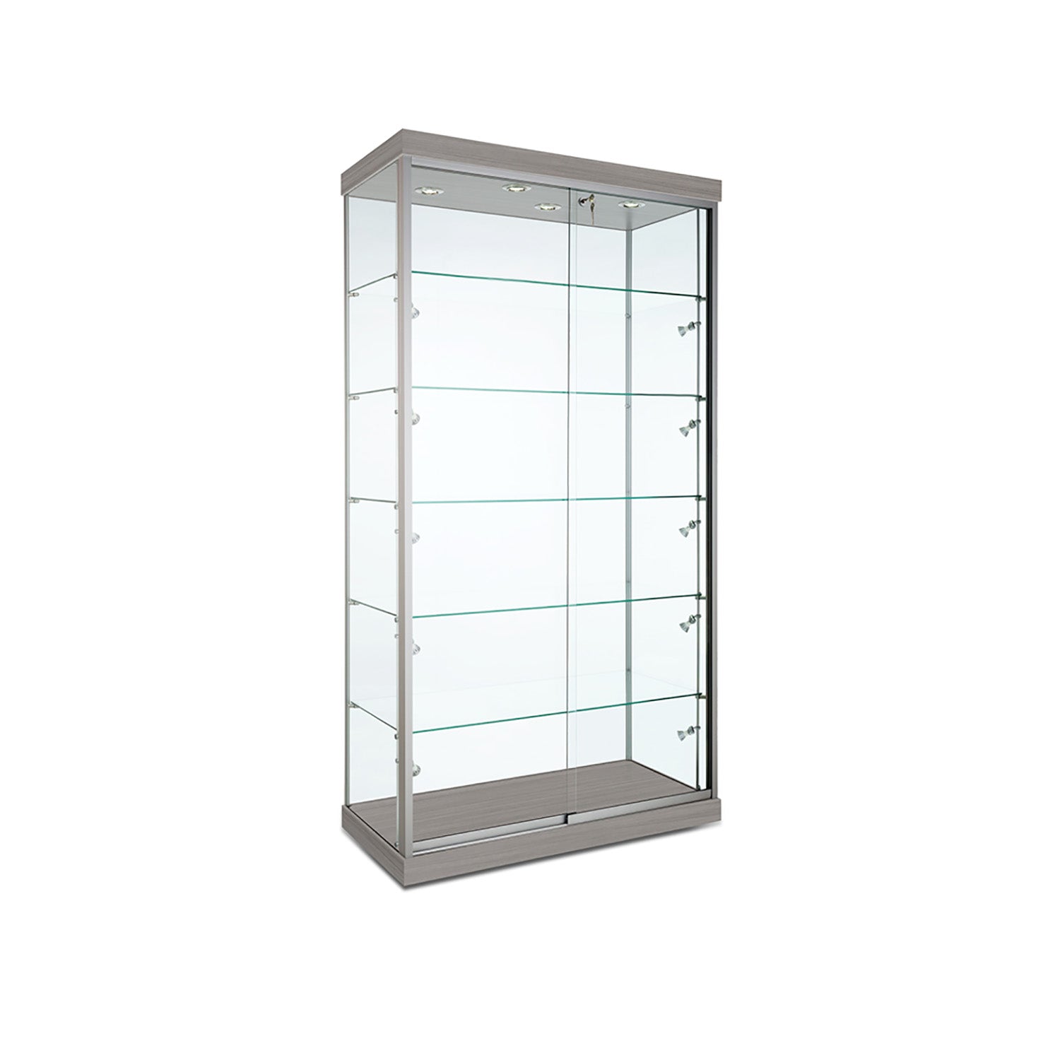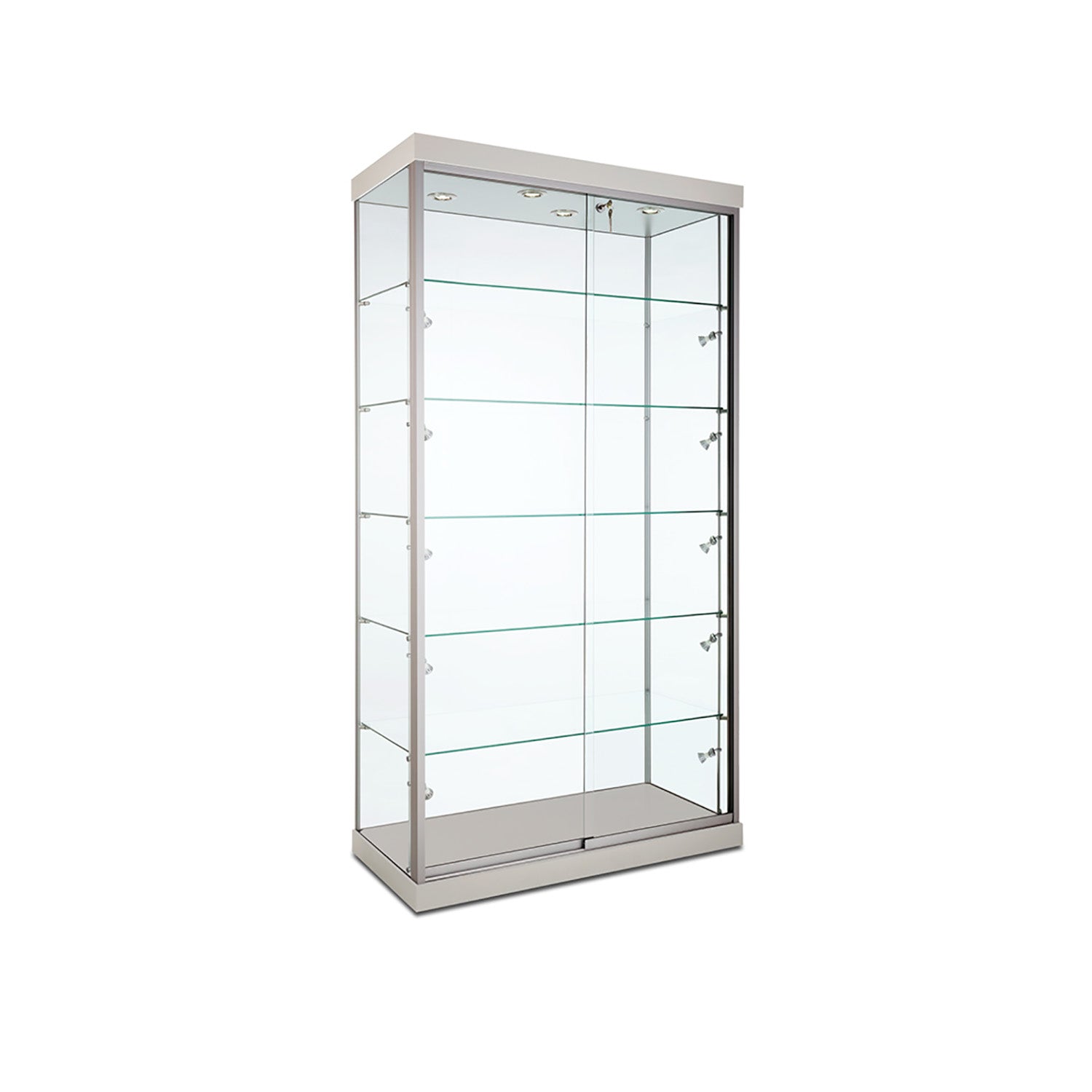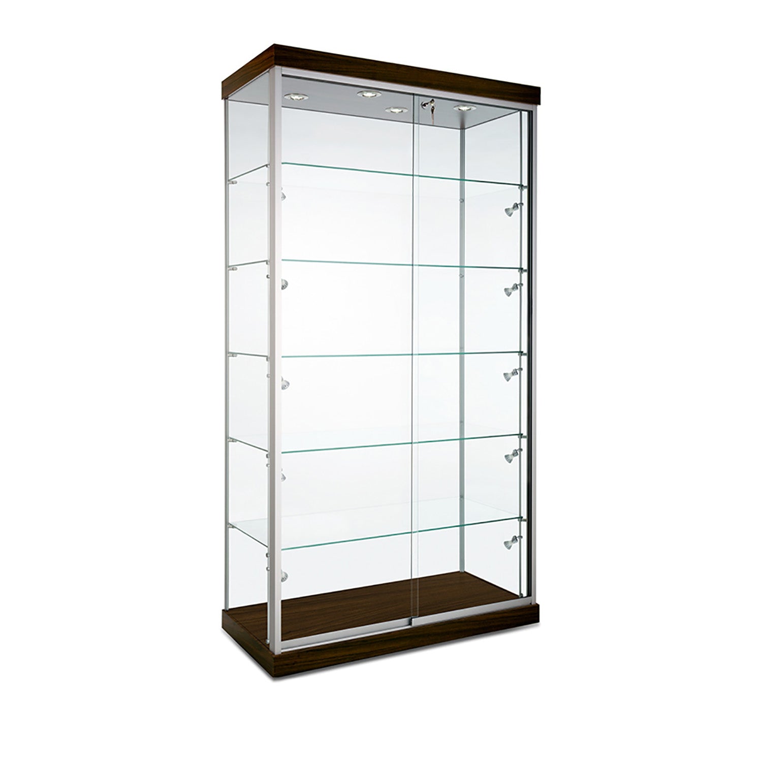 The TE-TD200 is an attractive rectangular trophy showcase with five fully adjustable 1/4” thick glass shelves that display any objects in an organized environment. With a clear glass back, clear glass front, and clear glass sides, it offers an unobstructed view of the objects being displayed. The use of tempered glass allows for safety and durability. Locking sliding doors are effective at offering added security. The TE-TD200 is truly a magnificent showcase that can be customized to fit a variety of display needs.