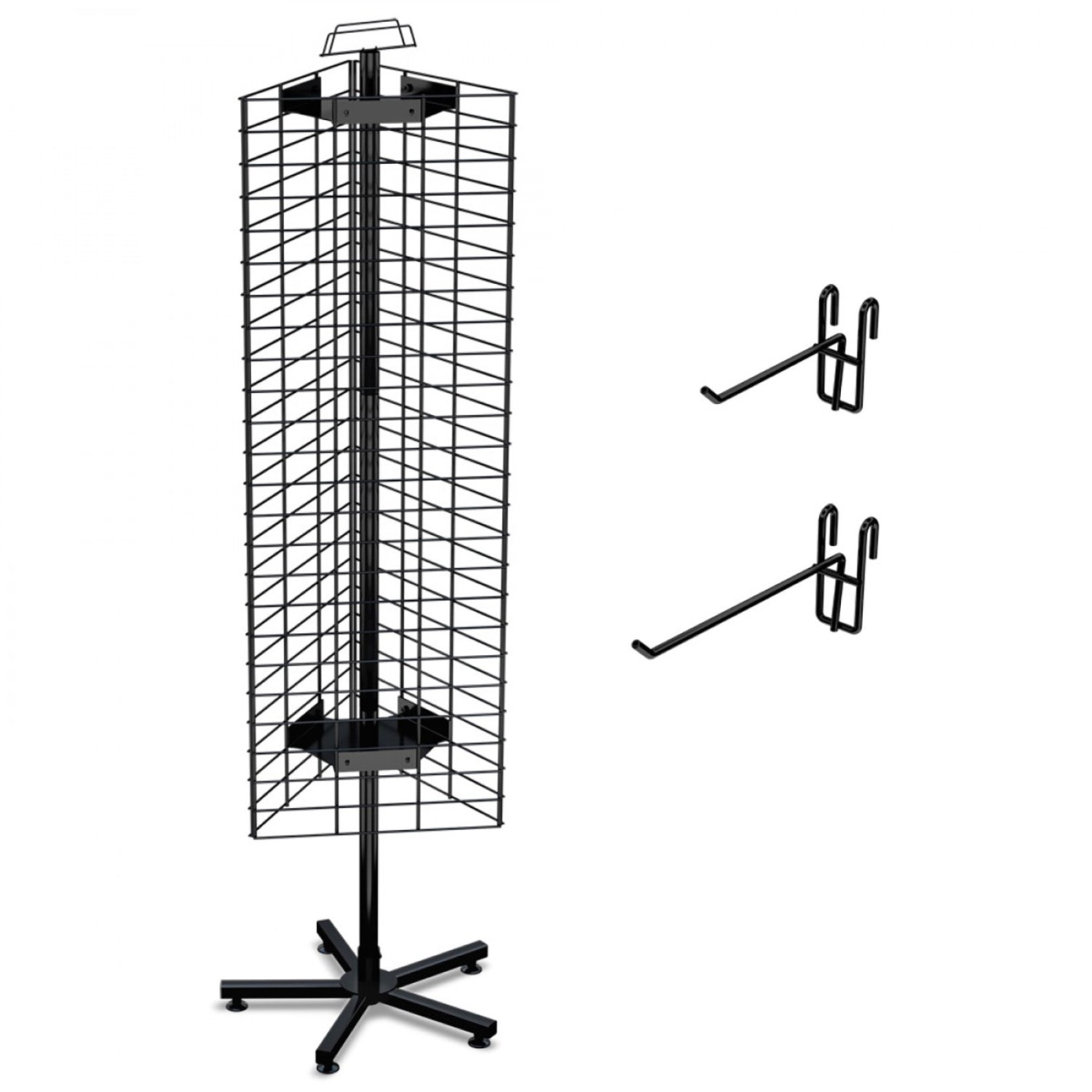 When you need an easy, versatile display for your merchandise that can be altered with ease to reflect the merchandise that changes with the seasons, new merchandise based on products that you’re currently featuring, or changing customer needs, this three-sided wire grid floor display is the best way to accomplish it. This rotating grid merchandiser makes it easy for customers to browse through all the products on offer from any side. Each of the three grid panels, which allow for the placement of 4” and 6” hooks (sold separately) where they’re most convenient for you, measures 48” by 16.25”; the overall height of the display is 67”.
