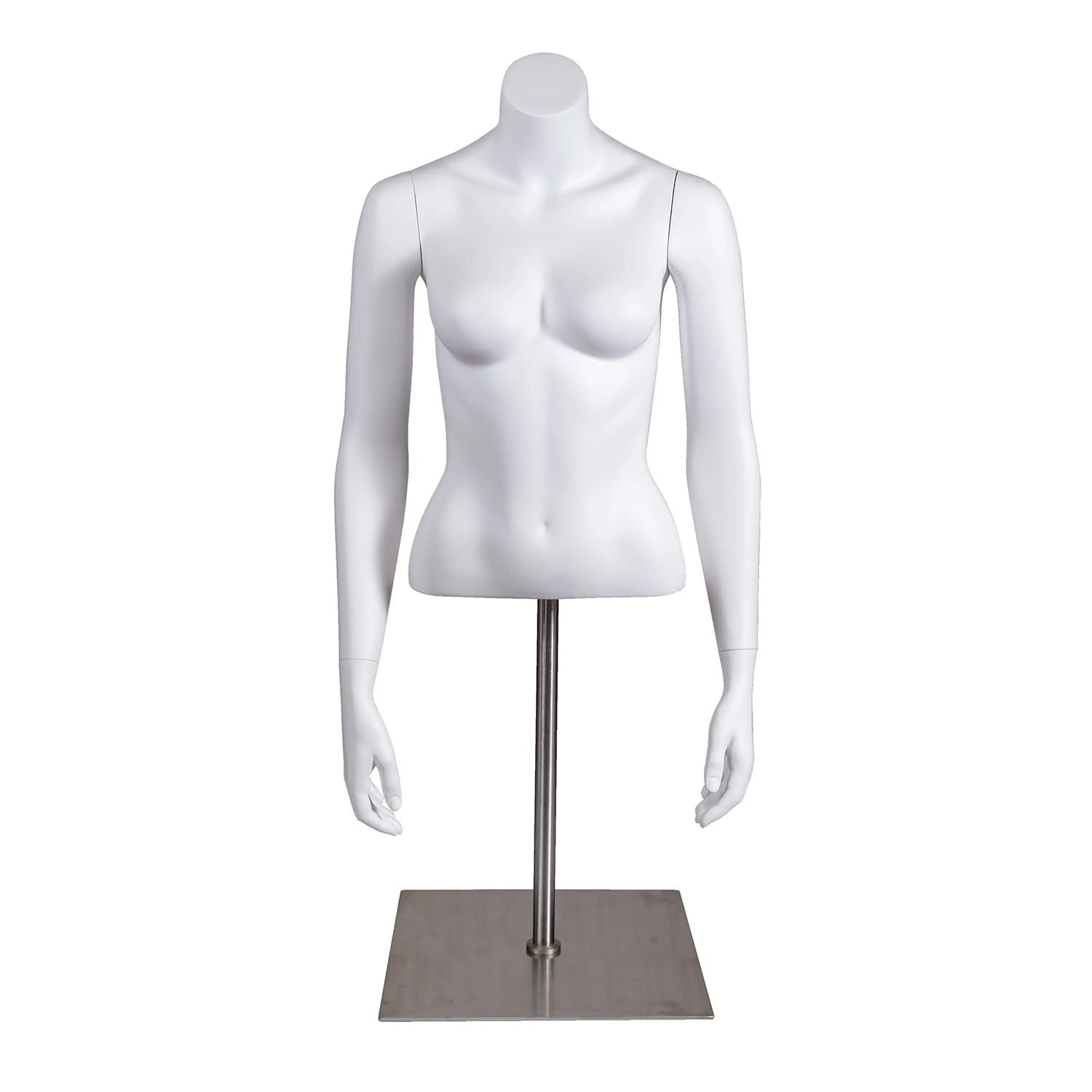 The headless female torso mannequin is a cost-effective solution for showcasing women's clothing. These torso forms are ideal for presenting garments on top of a merchandise display or table. Our mannequin features arms positioned at its sides for effortless outfitting.