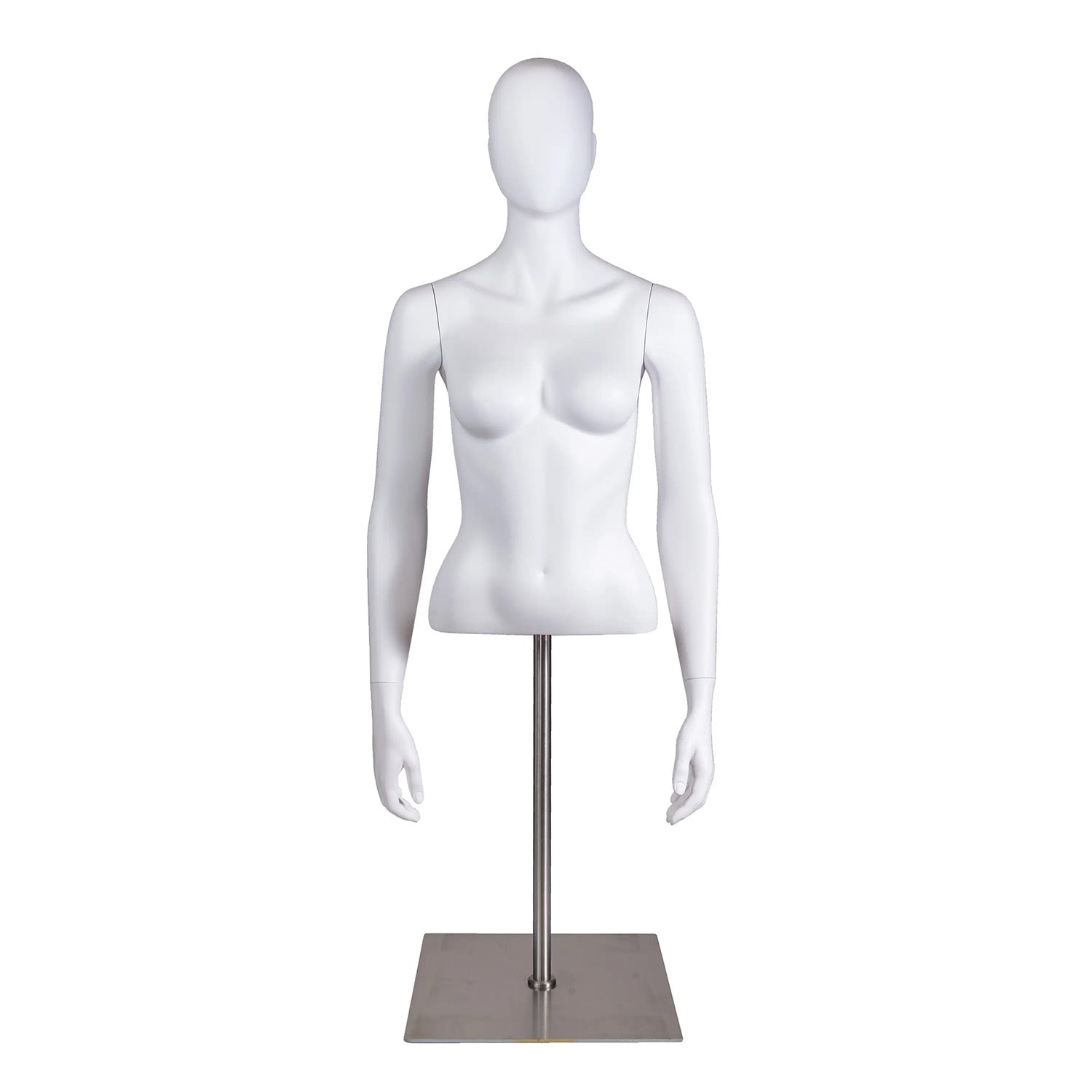The female torso form helps you display female clothing at an affordable price. Torso forms are great for displaying garments from atop a merchandising display or display table. Our form has it's arms at it's side for easy dressing. Includes an abstract head.