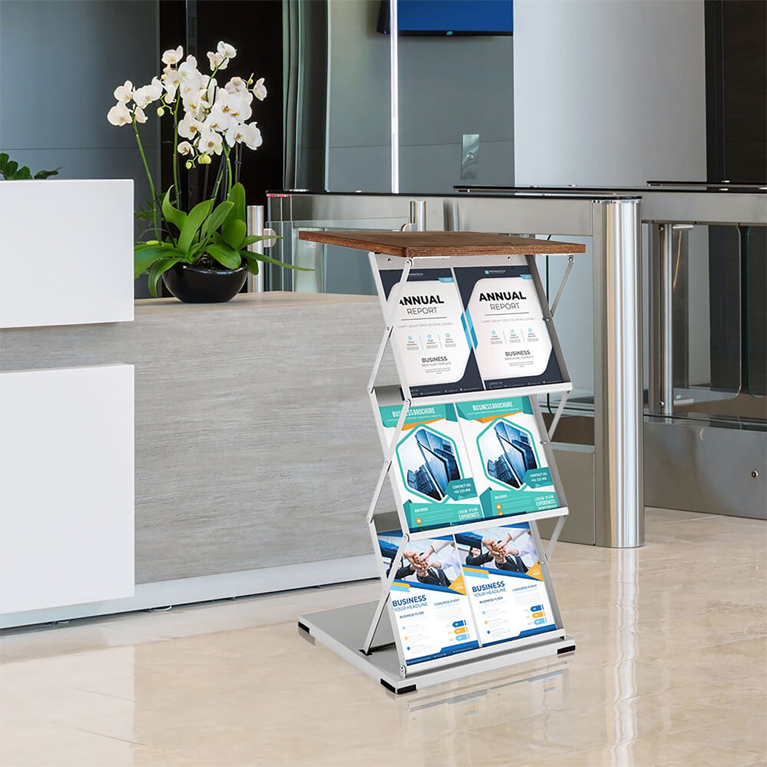 - Dual-Width Media Racks: Three heavy-duty steel tiers are wide enough to hold two side-by-side 8.5" x 11" catalogs, magazines, or flyers, ensuring your marketing materials are always organized and accessible.