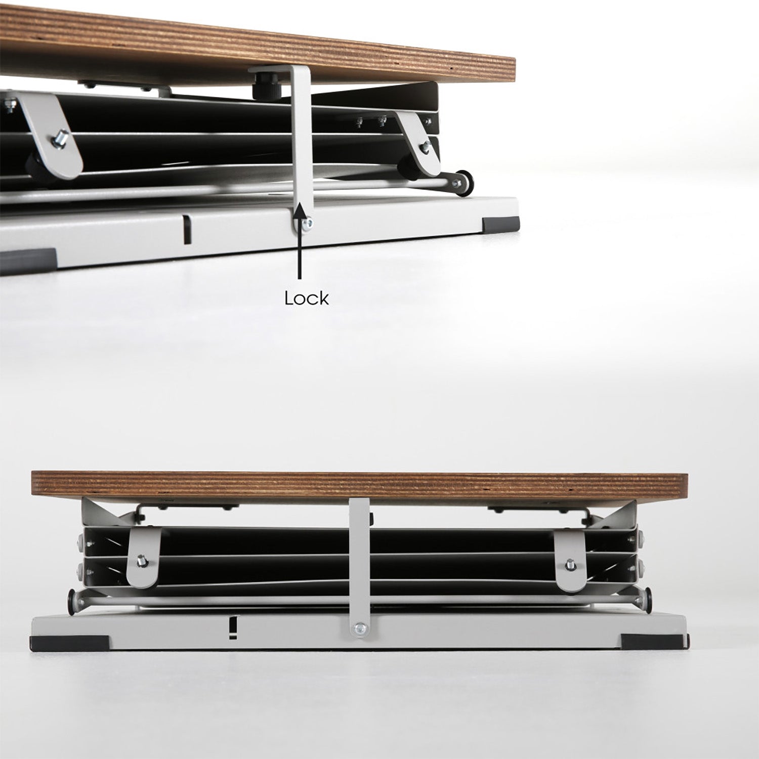 The perfect intersection of industrial strength and organic style. This premium 2-in-1 workstation features a professional Gray powder-coated steel frame topped with a high-quality real plywood surface. It is designed for exhibitors who want to break away from standard plastic displays and offer a warm, high-end feel at their events.