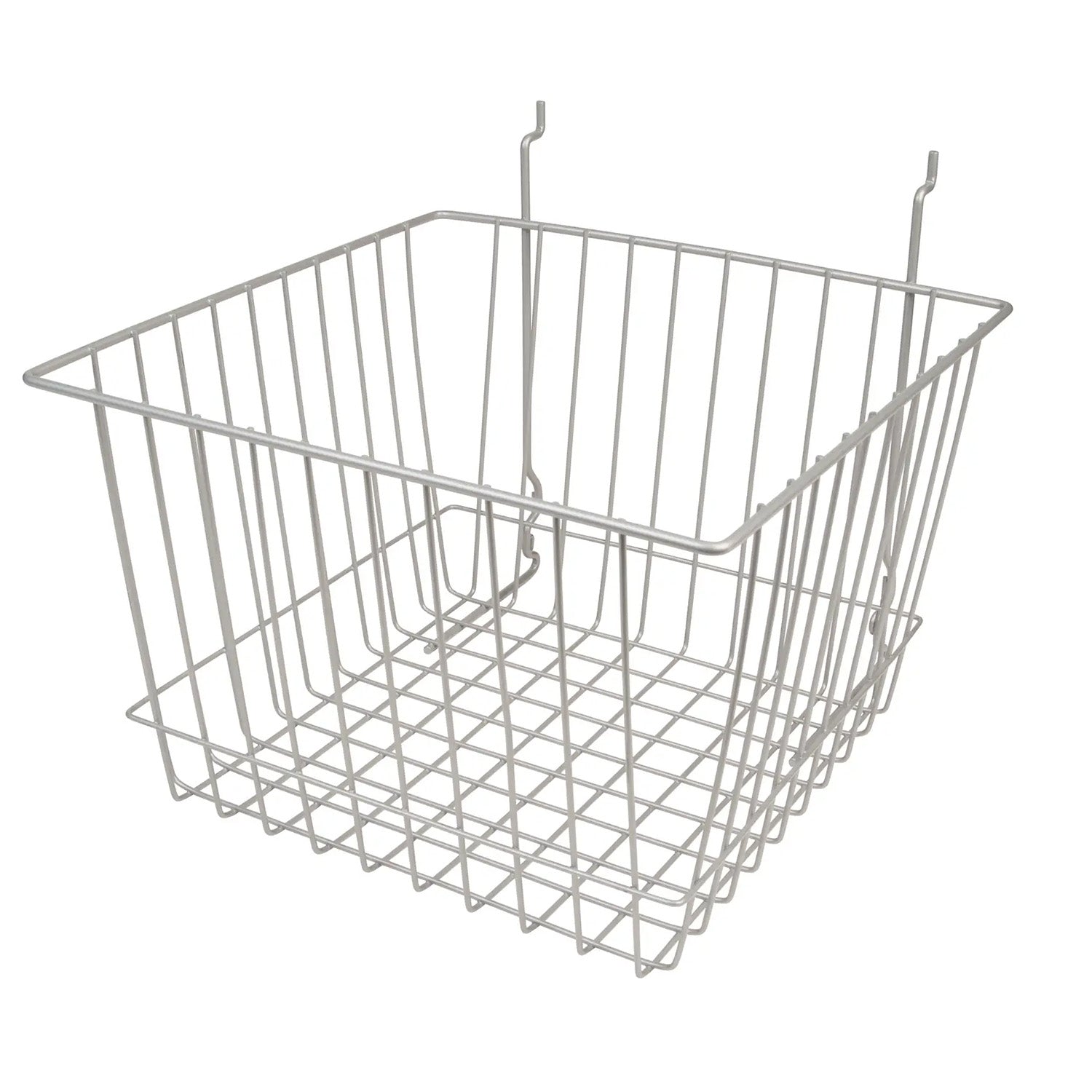 12"W x 12"D x 8"H multi-purpose coated wire basket accepts light to medium weight merchandise either loose or in packages. Our universal baskets mount easily to Grid panels, Slatwall panels, and Pegboard panels. No mounting hardware necessary. Wire is ⅛" thick and will not bend easily. Black epoxy coating will not chip or scratch easily for a long service life. Baskets may be stacked for storage when not in use. Baskets are an ideal way to attract shopper attention to overlooked, loss leader, or promotional items. Open baskets make self-service easy and allow for quick replenishment and changeovers.