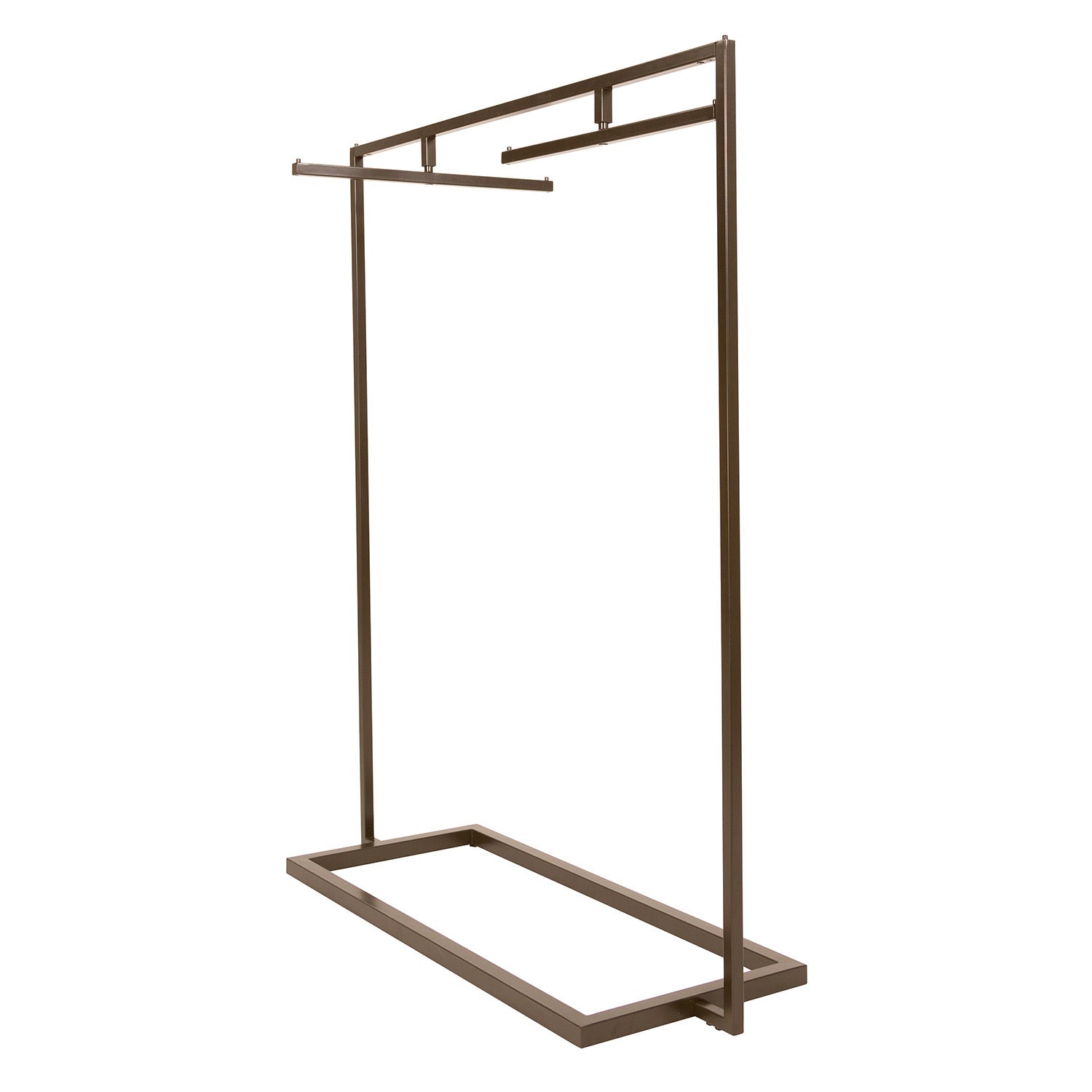 Our floor units such as the Extended Ballet Bar With Swivel Hang Bars offer multiple built-in display options. The swivel hang bars provide the ideal solution to display high-end designer collections, as well as seasonal and special occasion apparel. Our ballet bar measures 66"H x 54"W x 20"L with 25-1/8" hang bars with end stops. The swivel feature allows shoppers to self-serve and well as facilitates changeovers. The sturdy, 1" round tubing construction (base is constructed from square tubing) is finished in Statuary Bronze epoxy for an upscale ambiance. The unit includes levelers to compensate for uneven floor surfaces. Assembly is required as the unit is shipped flat to save on freight expenses.