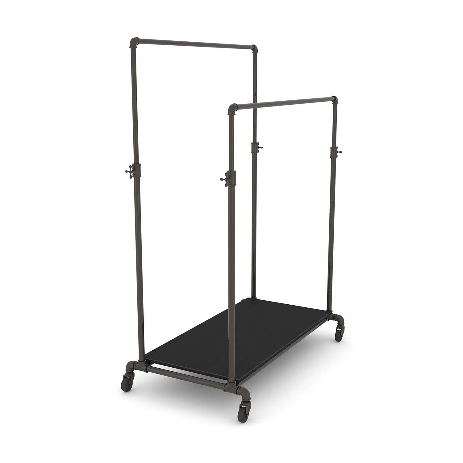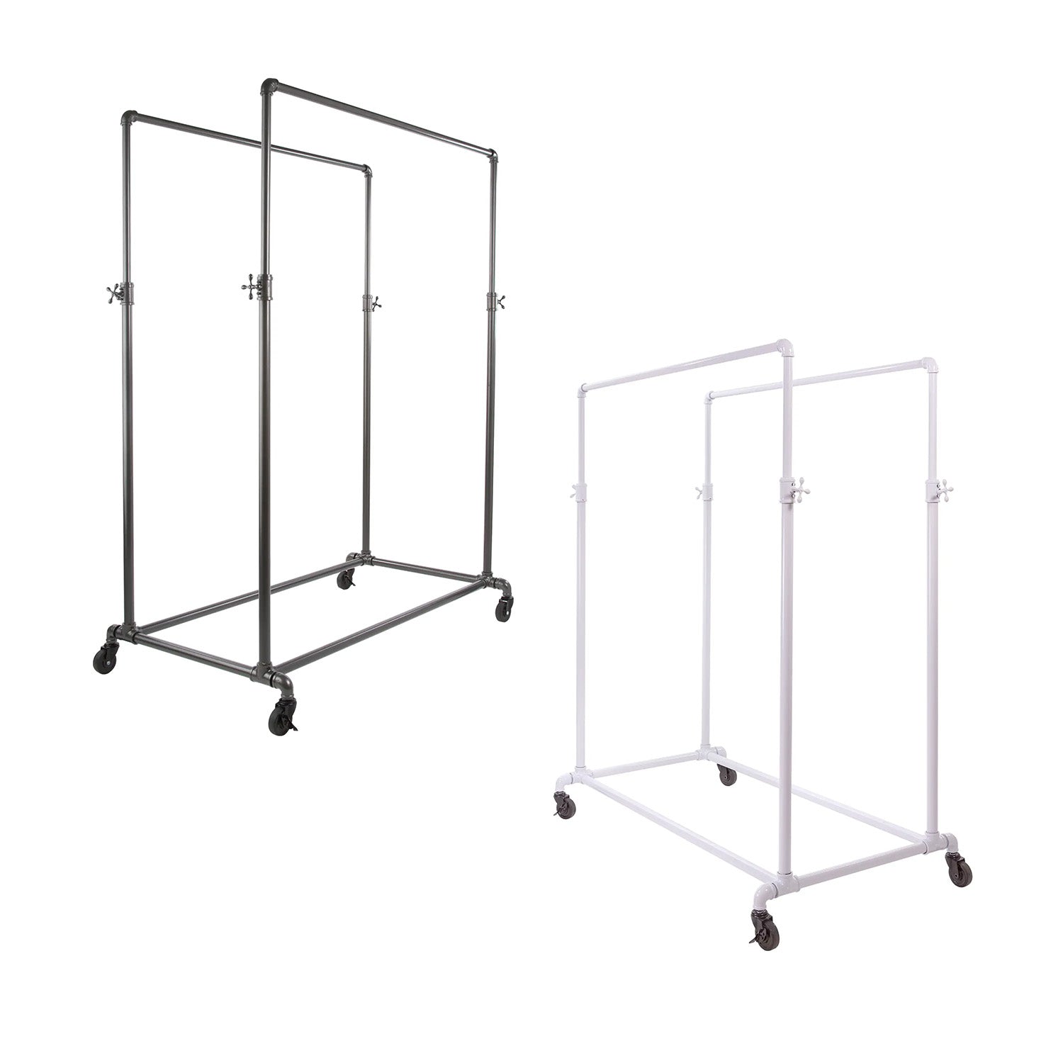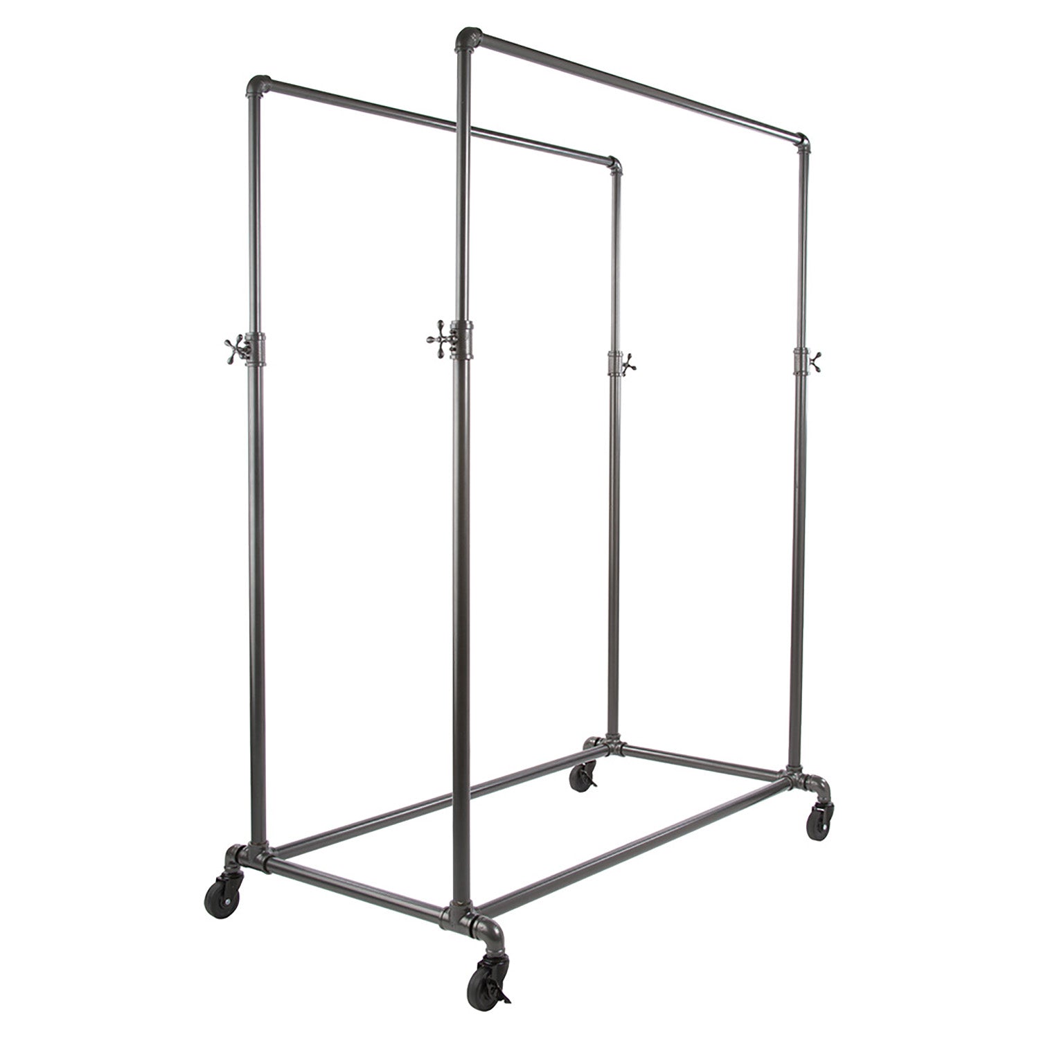 Our Pipeline Double Ballet Bar is available in fixed and adjustable height models. The adjustable ballet bar measures 50" W x 29" D and the bars adjust independently from 50" to 78" in height. The frame is constructed of heavy duty 1¼" diameter plumbing pipe with a chip- and scratch-resistant anthracite grey finish. Four 3" casters, 2 locking, and 2 non-locking, are included.
