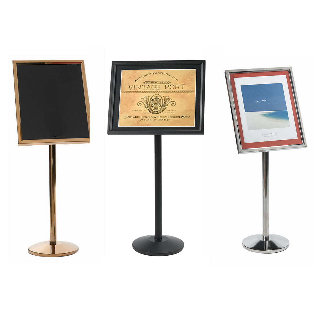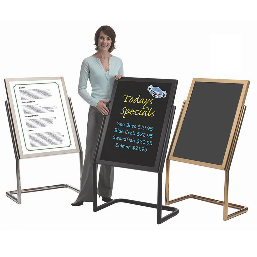 These menu boards & sign display stands are provide an attractive holder for your restaurant, lobby or anywhere you need to inform your customers or visitors of important information. Ideal for Hotels, Restaurants and other distinctive environments. Heavy-duty welded construction adds stability at busy locations. Rear panel is removable without tools for easy unloading and replacement of Signs, Posters and Menus. Complete with acrylic cover. Choice of 3 frames finishes: Chrome, Brass, Black. Our beautiful heavy-duty Hostess Station will welcome your customers with class. Use for seating arrangements, reservations and menu display. Subtle lighting illuminate in dark environments.