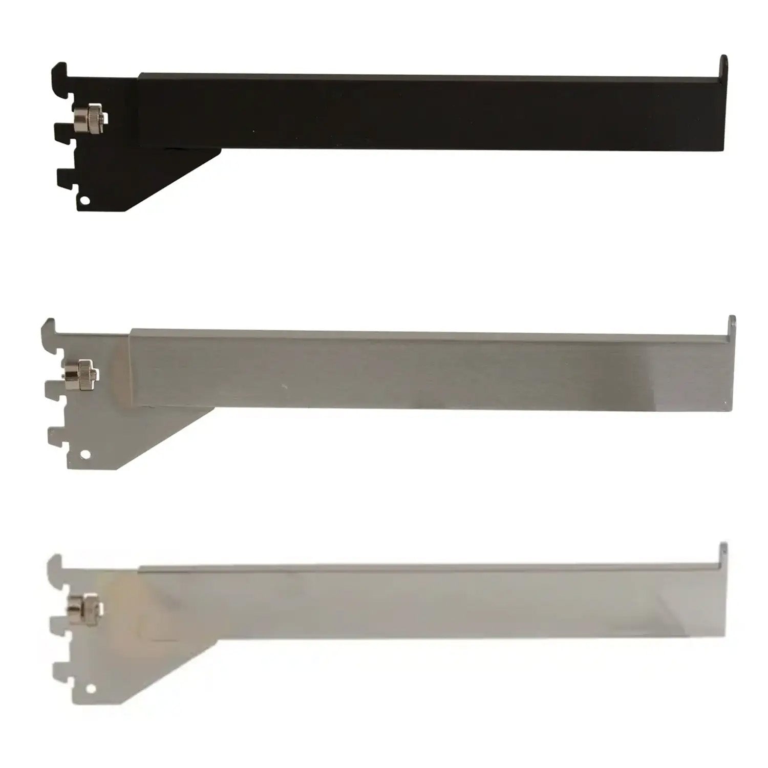 For use with surface mount slotted standards with 1/2" slots on 1" centers. Made of 1/2" x 1-1/2" rectangular tubing. Can not be used with recessed standards.