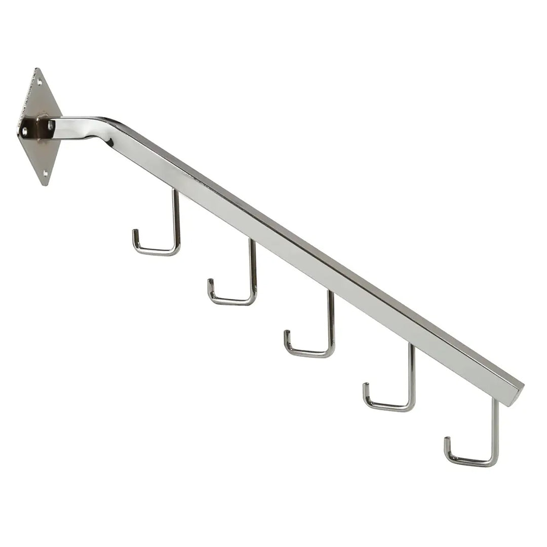 Replace worn fixtures or update your retail store's appearance with Econco's Perimeter Hardware Wall Mount Hardware. Available in 16-gauge, chromed steel, the hardware comes in coordinating dressing room hooks and 12' rectangular, 12' square, 5-hook waterfall with square stops or a 7-ball waterfall for square tubing.