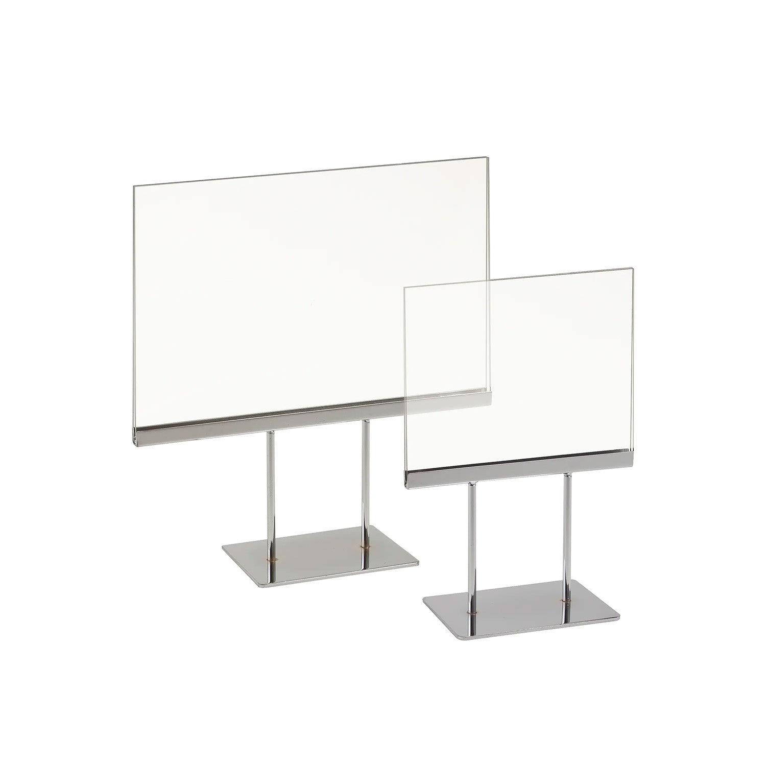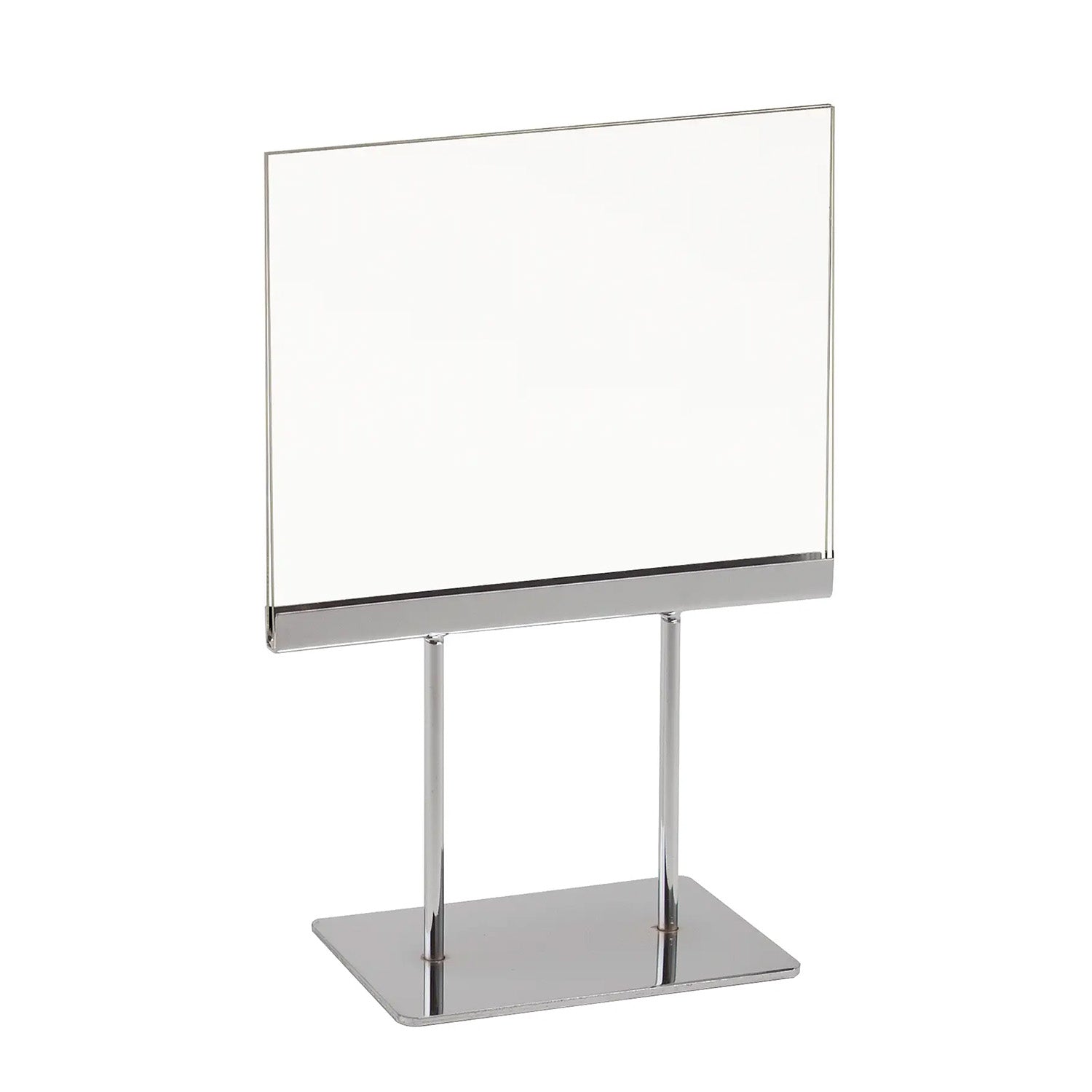 Our countertop sign holder with chrome base is an elegant way to get your message across. Sign holder has two chrome 4"H stems attached to a chrome base allows for greater visibility. Primarily used on countertops, shelves or dump tables.