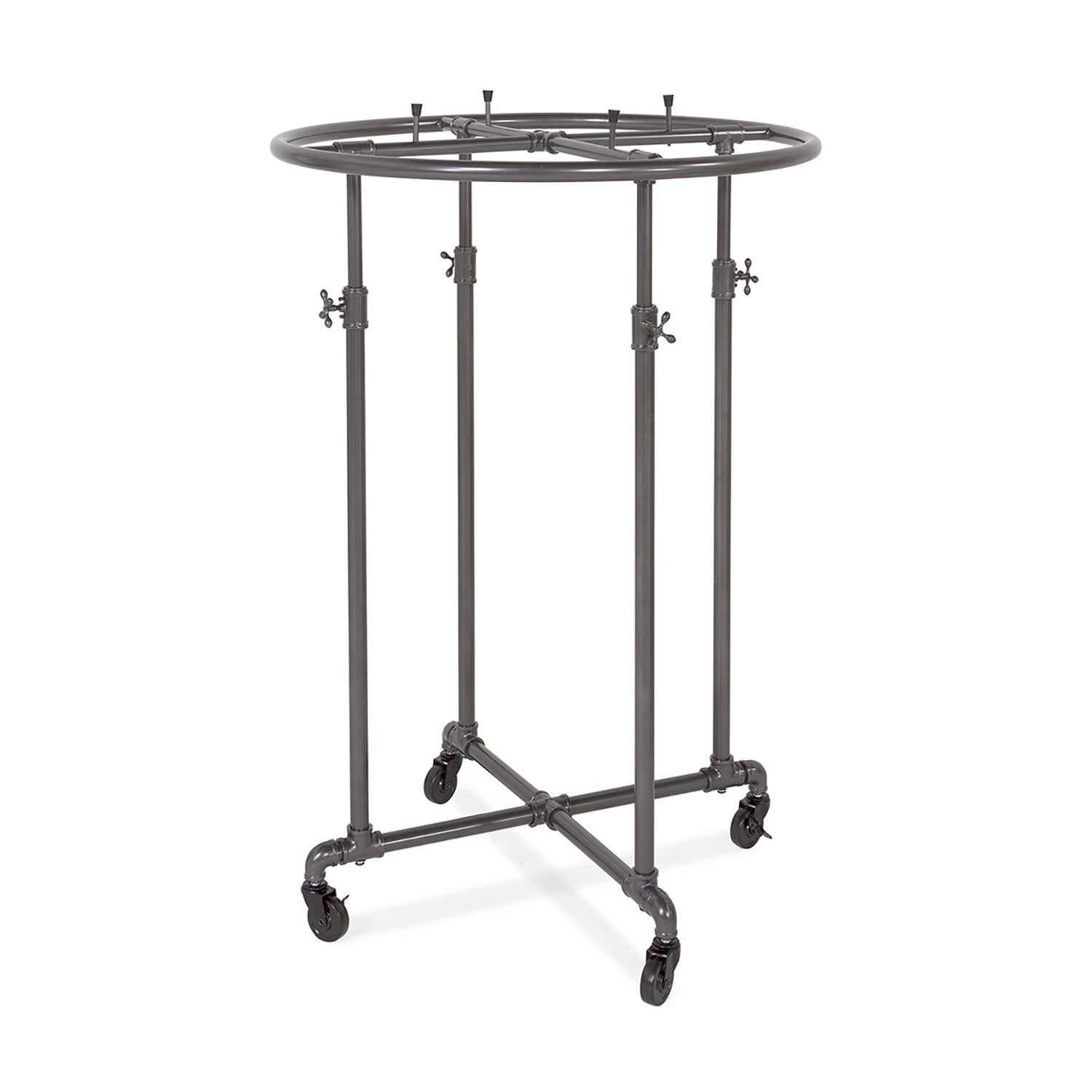 The Pipeline Collection has been popular since it was introduced. Inspired by the racks seen throughout Manhattan's Garment District, the collection is also made from plumbing pipe and connectors but finished in an attractive and durable anthracite gray epoxy. The circular hangrail is adjustable from 45" to 67" high and allows retailers to display a sizeable amount of merchandise within a very compact footprint on their selling floor- 26" x 26". The uprights and hangrail are made of 1¼"pipe with four 3" casters, two that lock. In addition, the unit comes with four rubber-tipped shelf supports. We carry glass, and MDF tops to fit this diameter rack. Round rack toppers sold separately.